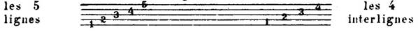 La portée est un ensemble de 5 lignes horizontales, également espacées. Entre elles il y a 4 interlignes. Les lignes et les interlignes se comptent de bas en haut :